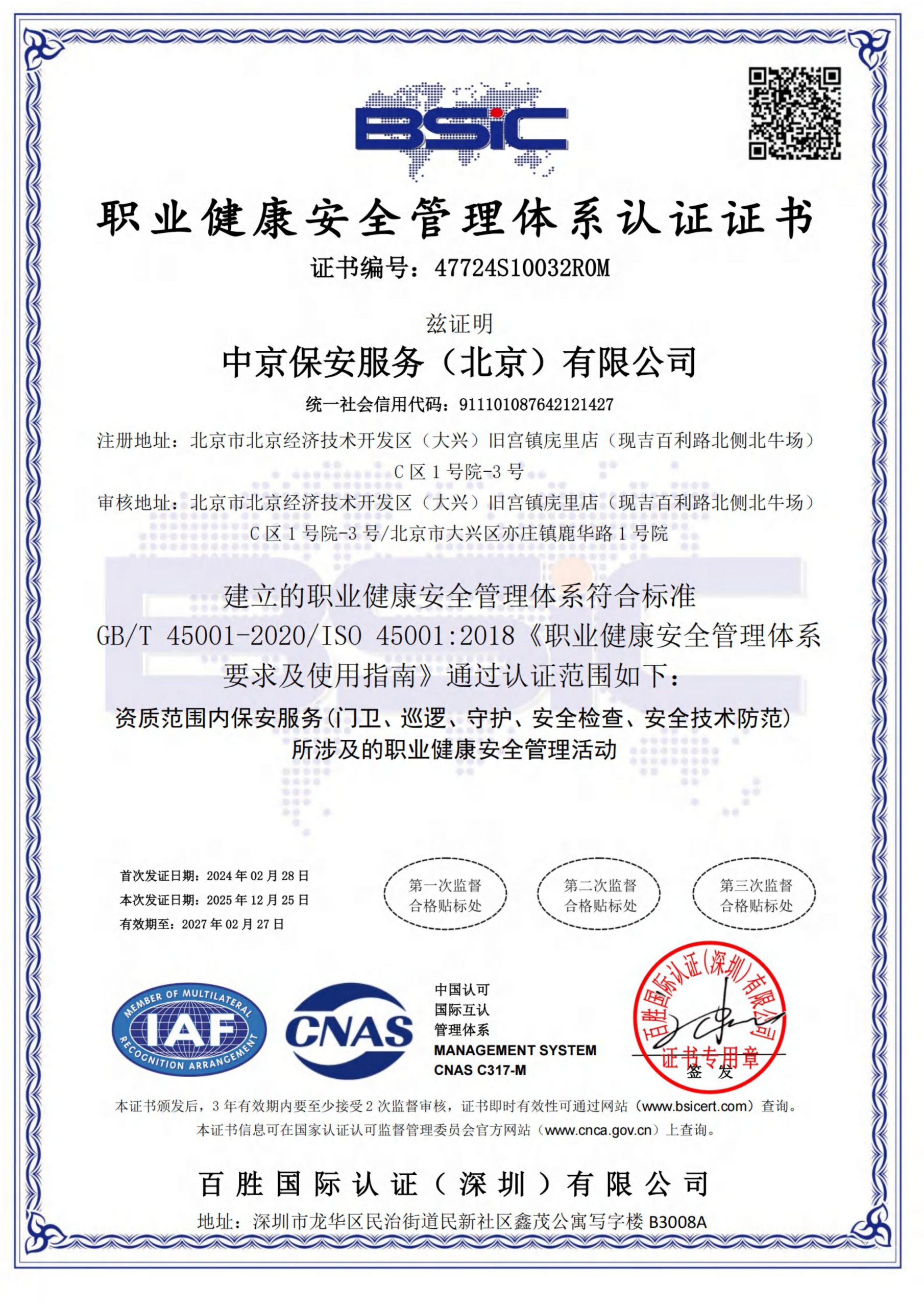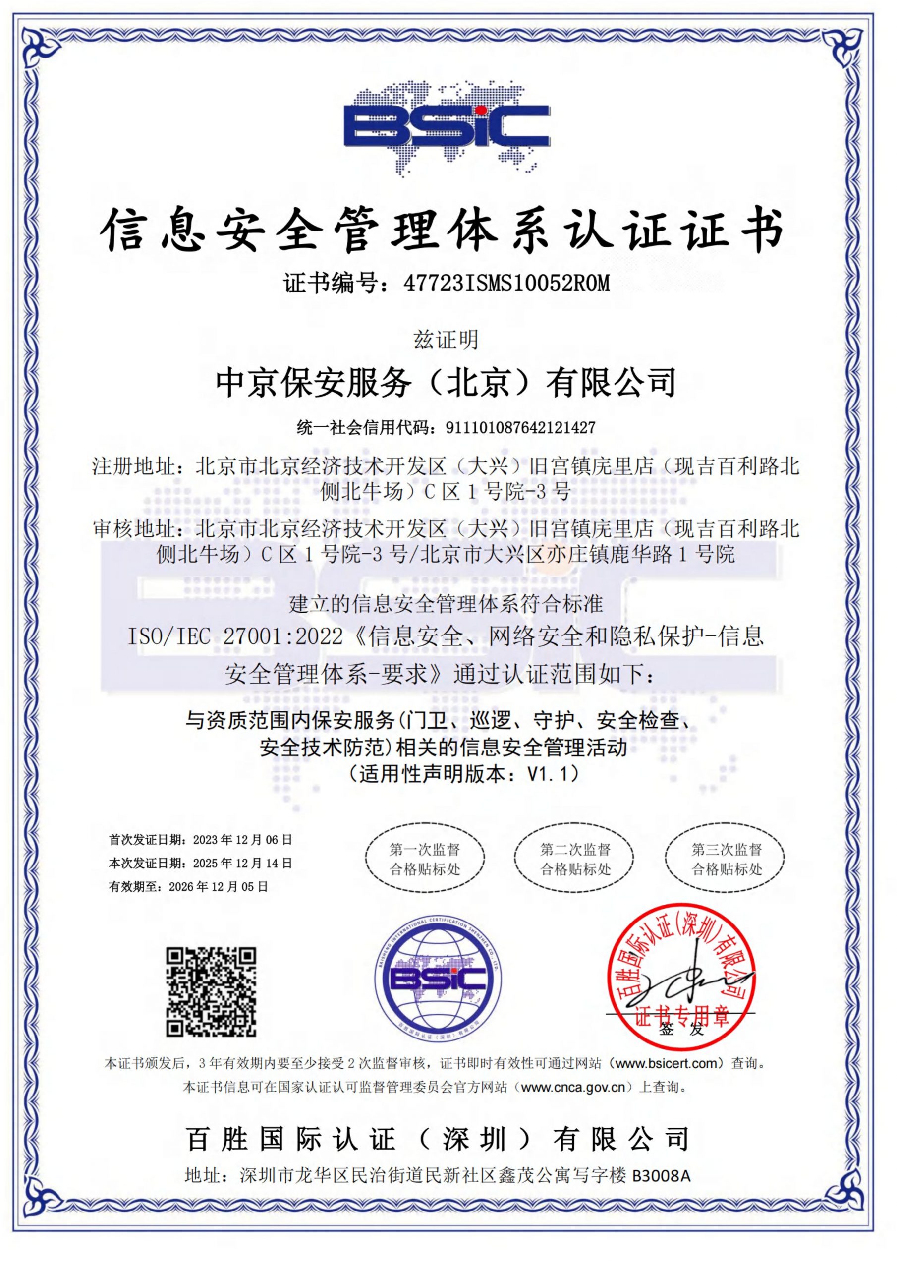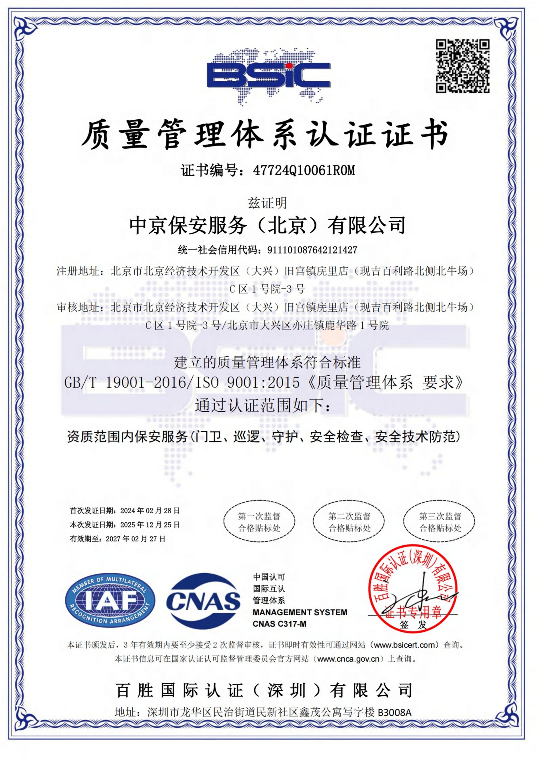 首页/资质荣誉 资质荣誉 保安服务一级证书 企业信用等级证书 安保服务企业一级资质 劳务派遣经营许可证 质量管理体系认证 环境管理体系认证 职业健康安全管理体系认证 信息安全管理体系认证 反贿赂管理体系认证 诚信管理体系认证 保安服务认证 重合同守信用企业证书 诚信供应商等级证书 诚信经营示范单位证书 质量服务诚信单位证书 AAA级资信等级证书 行业诚信单位等级证书 QES中京保安服务(北京)有限公司正式版_01 QES中京保安服务(北京)有限公司正式版_02 QES中京保安服务(北京)有限公司正式版_03 保安服务许可证副本 营业执照 人力资源服务许可证 中国保密企业服务资质证书 中京食品经营许可证 企业信用等级证书 北保协常务理事单位 冬奥会支援荣誉证书 冬奥会安保荣誉证书 2019国庆安保勤务单位 安康杯优胜单位 年度安康杯优胜班组荣誉证书 安保警卫智能指挥 安保移动终端综合控制 智能安保核查管理 安防工程企业资质证书 北京市政府采购 CBA优秀赛区安保奖 北京保安协会常务理事 西城分局国庆70周年安保工作优秀服务单位 企业统一 中国保安服务十大影响力品牌 央企中标通知书央企中标通知书 北京市创新品牌100强 工会会员证书 亦庄教育服务站 保安服务许可证 中海物业2024年度优秀供应商 北京保安协会第二届理事会会员证书 诚信兴商倡议企业 防暴力管理体系认证证书 反恐怖管理体系认证证书 奥运优秀组织奖 奥运安保服务纪念 2016劳务派遣许可证 2010集体二等功 2009诚信3A证书 2009十大诚信品牌 国庆安保勤务单位 基层建设先进单位 企业管理年先进单位 全国先进保安员获得者 先进保安班队 先进保安公司 北京市企业创新信用领跑企业 安全检查委员会证书 乌克兰表扬信 人力防范类一级企业